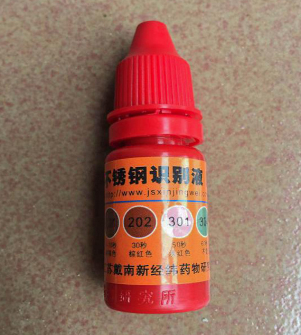 泫氏廠家對不銹鋼卡箍材質采用光譜分析儀進行檢測;用戶也可采用不銹鋼識別液進行鑒定,這是一種通過識別卡箍材質是否含鎳來判斷劣質200系列卡箍和300系列卡箍的簡易方法,如圖所示。
